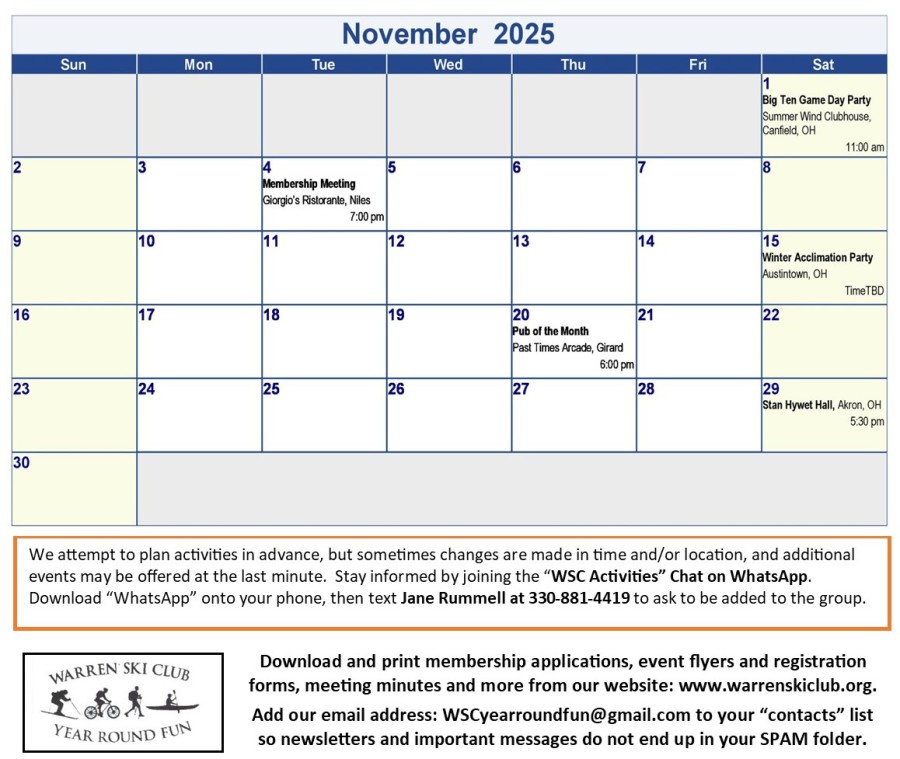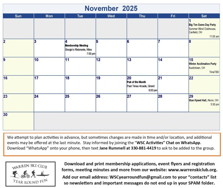Club membership is not required for many of our events. Non-ski activities include: kayaking, bike-riding, hiking, winery tours, bus trips, and Pubs-of-the Month. Additional events and activities can be added at any time, so watch our Facebook Page for new invitations to enjoy "year-round fun" with the Warren Ski Club.