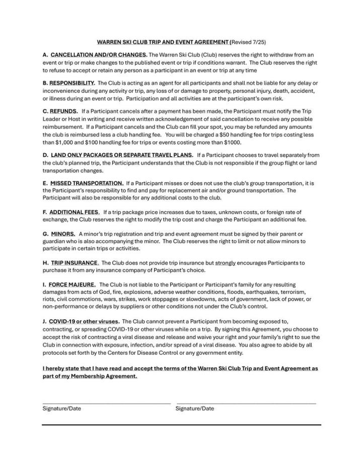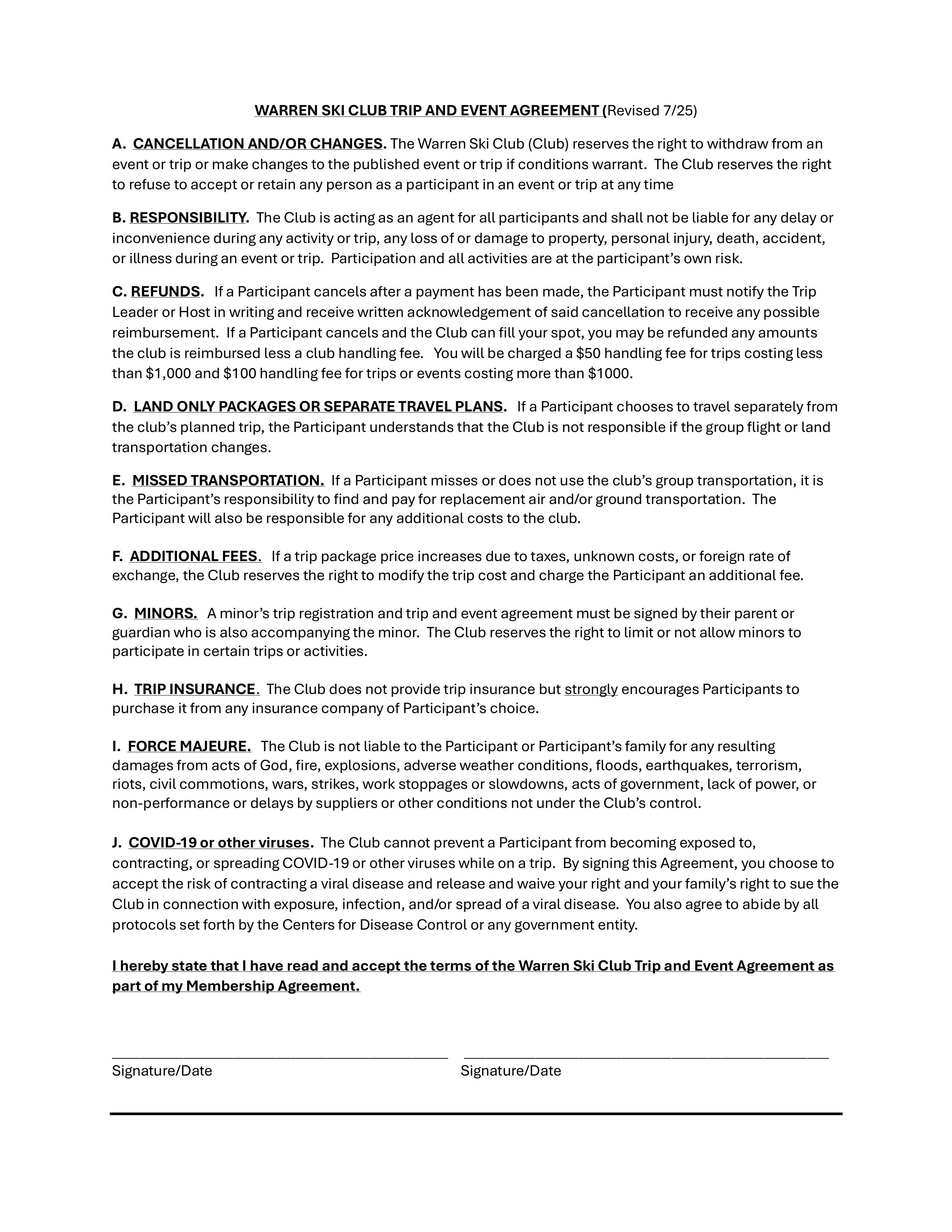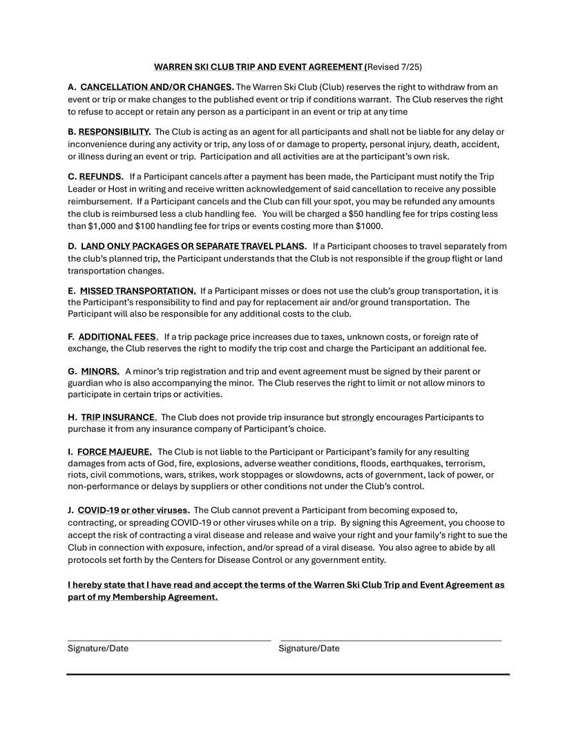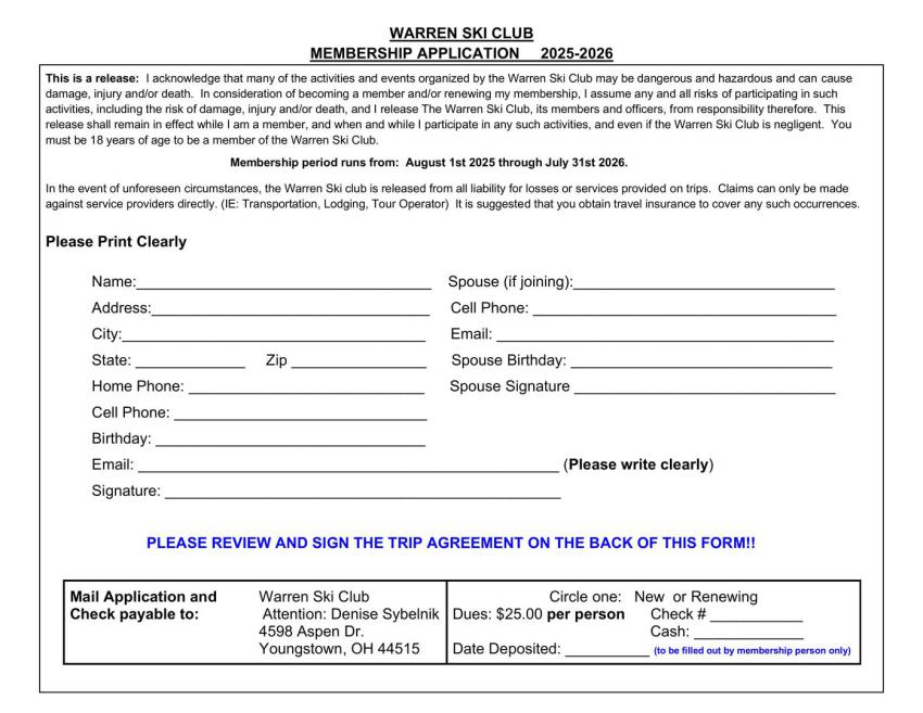 To print a form, click on the JPEG file below the application, or contact the Warren Ski Club Membership Chairperson at 330-518-8585 or Denise.activities@gmail.com to request an application to mailed to you. Remember to complete both pages of the application.
