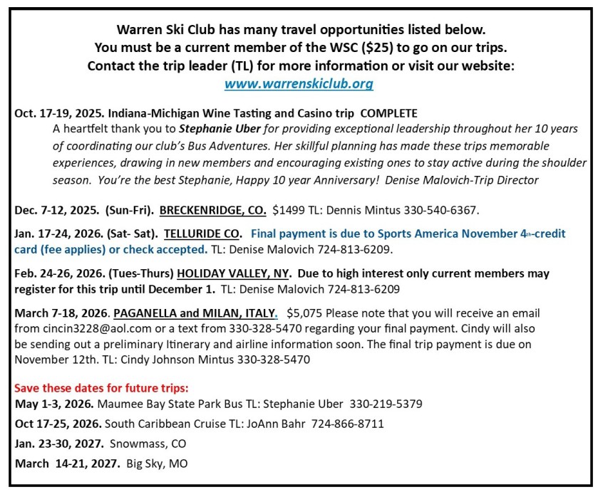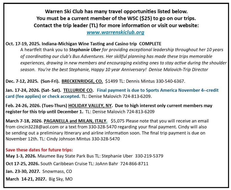 Travel the world with a great group of people when you join the Warren Ski Club