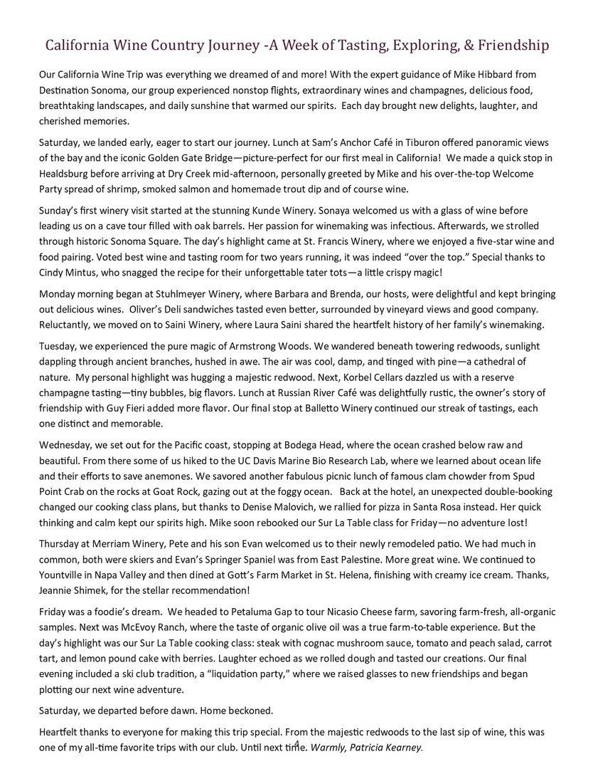 In September, 2023 the Warren Ski Club completed the trip of a lifetime to the amazing Amalfi coast of Italy. This eleven-day adventure was designed by our trip director with the help of professionals at Perillo Tours to meet the varied interests of an active Ski Club group. We toured multiple antiquities and two countries by bus, Jeep and boat. We swam in beautiful hotel pools and in the Mediterranean Sea, climbed two volcanos, rode a chairlift to the top of the Isle of Capri, ate fabulous meals, and shared great wine. The following photos capture just some of the fun and excitement of a fabulous trip.